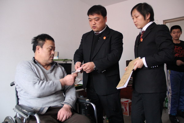 图为南山区法院执行局法官上门为残疾当事人发放执行款