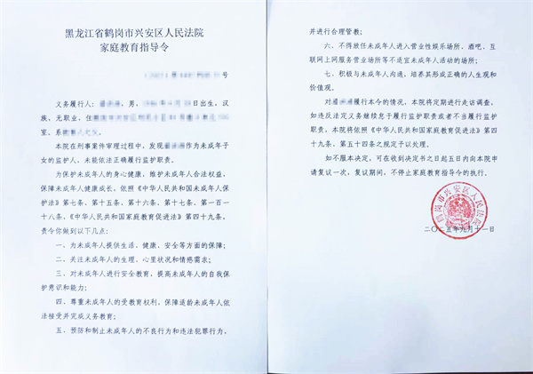 近日,兴安区人民法院在审理一起涉未成年人刑事案件中,发现该未成年人的监护人疏于监管,存在家庭监管不到位的情况。为维护未成年人合法权益,兴安区人民法院向监护人发出《家庭教育指导令》,责令其切实履行监护职责,关注未成年人身心健康发展,不得放任未成年人进入营业性娱乐场所、酒吧、互联网上网服务营业场所等不适宜未成年人活动的场所,并加强日常沟通引导,帮助其树立正确的人生观和价值观。