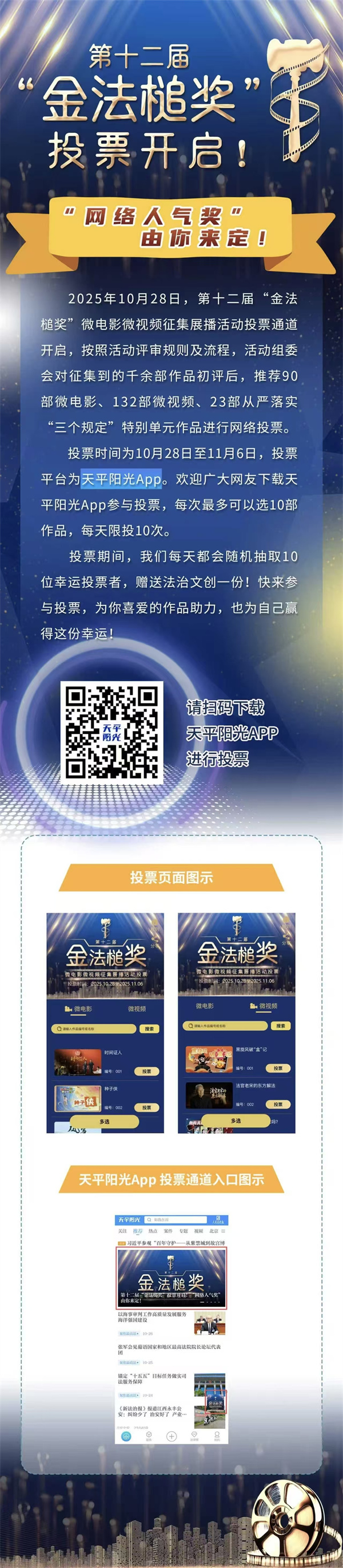 1、下载“天平阳光”APP,通过首页点击进入第十二届“金法槌奖”微电影微视频征集展播活动投票页面。