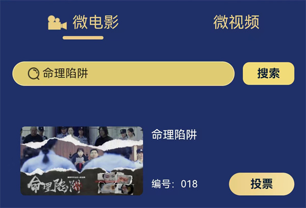 2、进入第十二届“金法槌奖”投票页面后,选择“微电影”搜索作品名或编号即可投票。