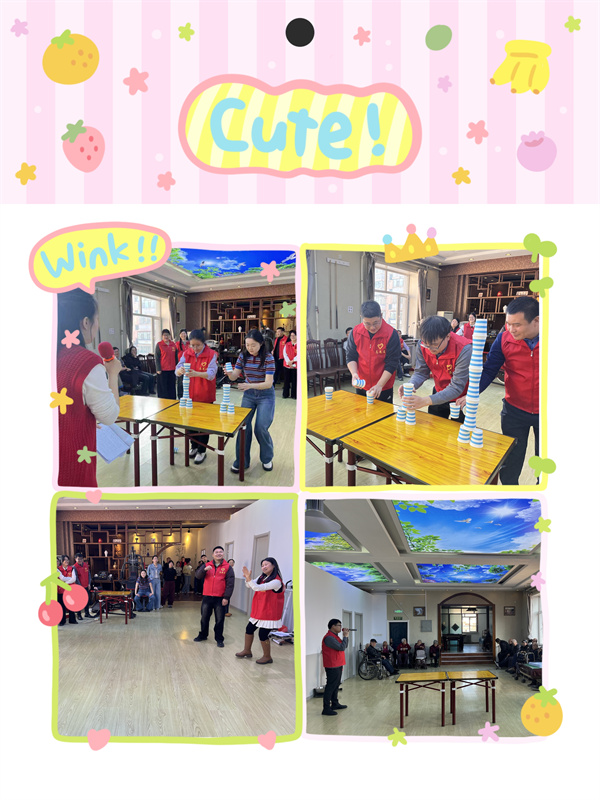 饺子下锅间隙,趣味游戏环节拉开序幕。志愿者们精心设计了“你比划我猜”“纸杯叠叠乐”等温暖有趣的游戏。现场掌声、欢呼声此起彼伏。对于行动不便的老人,志愿者们主动上前陪伴聊天,倾听他们的心声,详细询问生活起居与健康状况。随后的文艺表演更是将活动推向高潮。一个个精彩节目轮番上演,养老院里洋溢着温馨祥和的氛围。