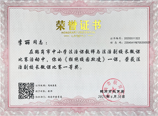 兴安区人民法院峻德人民法庭副庭长、红旗一校法治副校长李丽在鹤岗市教育局组织的鹤岗市中小学法治课教师与法治副校长微课比赛活动中,讲授的《拒绝校园欺凌》一课荣获法治副校长微课比赛一等奖!