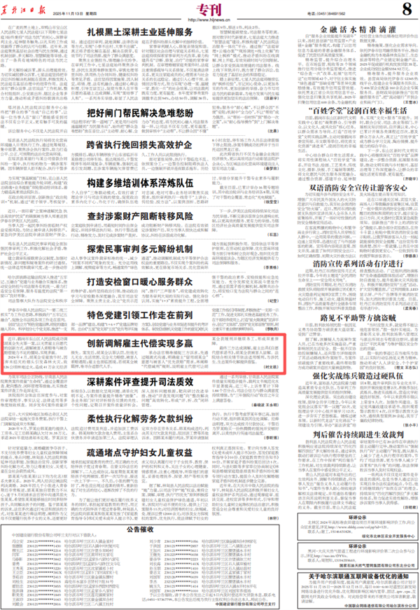 近日,鹤岗市东山区人民法院成功调解胡某全失火罪一案,以无责雇主自愿代偿的创新方式,破解被害人索赔难与被告人赔偿能力不足的僵局,实现多赢。
