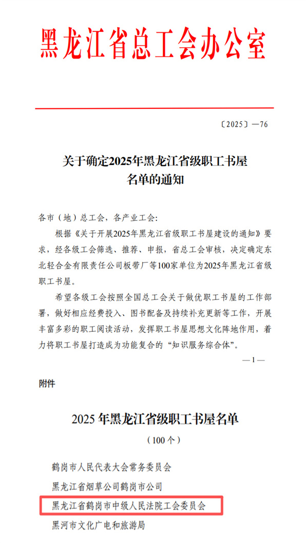 鹤岗市中级人民法院图书馆在全省省级职工书屋评选中,凭借丰富的馆藏资源、完善的设施条件、优良的阅读环境以及卓有成效的阅读推广活动,成功获评“省级职工书屋”荣誉称号!