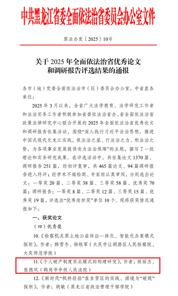 近日,中共黑龙江省委全面依法治省委员会办公室印发《关于2025年全面依法治省优秀论文和调研报告评选结果的通报》经初评复审、学术不端检测、专家组认真审阅,鹤岗中院候丽杰、张德凤撰写的论文《个人破产制度东北模式的构建研究》获得优秀奖。