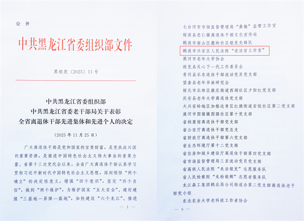 喜报!鹤岗市兴安区人民法院“老法官工作室”荣获中共黑龙江省委组织部、中共黑龙江省委老干部局“全省离退休干部先进集体”表彰。