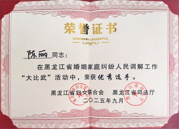 近日,向阳区人民法院综合审判庭副庭长陈丽在参加黑龙江省婚姻家庭纠纷人民调解工作“大比武”活动中,凭借扎实的专业功底、娴熟的调解技巧和良好的职业素养荣获“优秀选手”称号,充分展现了法院干警的卓越风采和为民情怀。