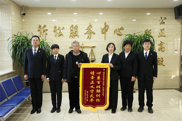 近日,兴安区人民法院“老法官工作室”成功化解一起买卖合同纠纷。当事人周某某为表达谢意,专程来到法院,将一面印有“心系百姓解纠纷 情牵正义守天平”的锦旗送到老法官手中。