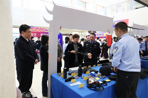 「装备文化」展区:防刺背心、防暴盔甲服……新旧装备对比,干警排队试穿,重量、材质现场比较,法警边演示边讲解展现“专业、创新”品格。