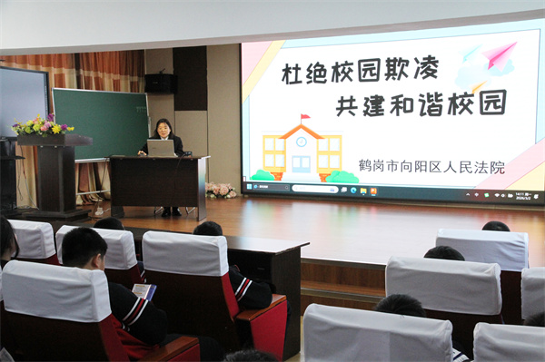 开学季来临,向阳区人民法院积极开展“法治宣传进校园”活动。霍元君法官以“杜绝校园欺凌,共建和谐校园”为主题,结合典型案例与未成年人特点,为同学们讲解校园欺凌类型、危害及法律后果,重点解读相关法律及刑事责任年龄规定,教授自我保护与求助方法,引导学生拒绝欺凌、不做旁观者,有效提升青少年法治意识和自我保护能力。