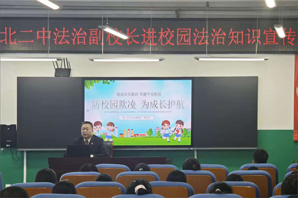 春风送暖,书香启序。为进一步加强未成年人法治教育,筑牢校园安全防线,近日,萝北县人民法院党组成员、审判委员会专职委员杨宝生以第二中学法治副校长的身份,以“防校园欺凌、为成长护航”为主题开展“开学第一课”法治进校园活动,为同学们送上一堂干货满满的法治教育课。此次活动,通过精准化的内容设置、沉浸式的互动体验,将法治精神厚植于学生心中,有效提升了师生的法治素养与安全防范意识。