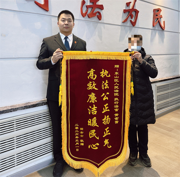 3月12日,东山区人民法院聚焦涉民生小标的案件审理,成功办结一起小额民间借贷纠纷案件。法官以简案快办、审执衔接为抓手,以支付令提速、快执机制为保障,实现速审、速执、速兑现,推动被执行人当场履行全部义务,案款一次性足额到位。当事人对法院高效、务实的工作作风表示高度认可,赠送锦旗表达由衷感谢。