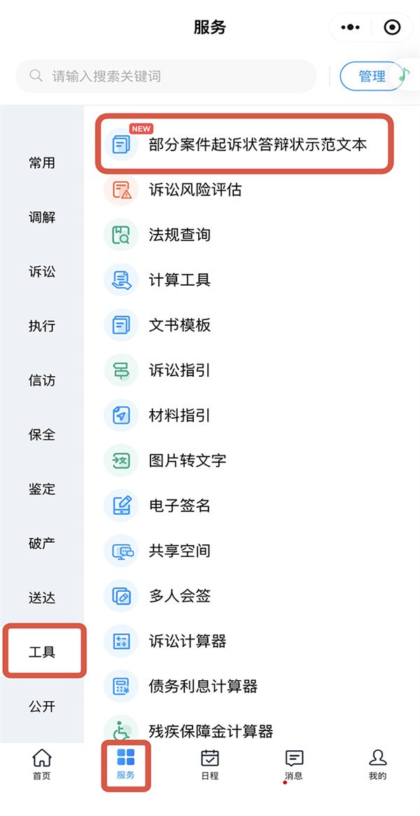 2、移动微法院平台获取:通过手机微信小程序登录“人民法院在线服务全国版本”,点击首页底端“服务”,进入左侧的“工具”选项,即可找到“民事起诉状答辩状示范文本”,随时随地获取诉讼文书模板。
